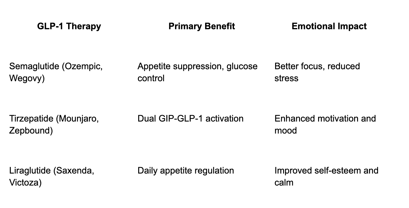 The emotional benefits of GLP-1 receptor agonists are backed by science. Studies show that drugs like Ozempic, Wegovy, Mounjaro, Zepbound, and Trulicity not only improve glucose control but also reduce stress-related hormones. This leads to mood enhancement with weight loss and less anxiety.